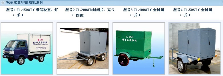 ZL—T系列真空滤油机是在A系列高效真空滤油机、S系列双级真空滤油机、Q系列全自动真空滤油机等基础上加装拖挂车体而成,设备的主要特点及性能请分别参阅A、S、Q系列机型页面介绍,车轮全部采用充气轮胎,装有减震弹簧钢板,若选带驾驶室的机型则带有刹车、转向机构、灯系。